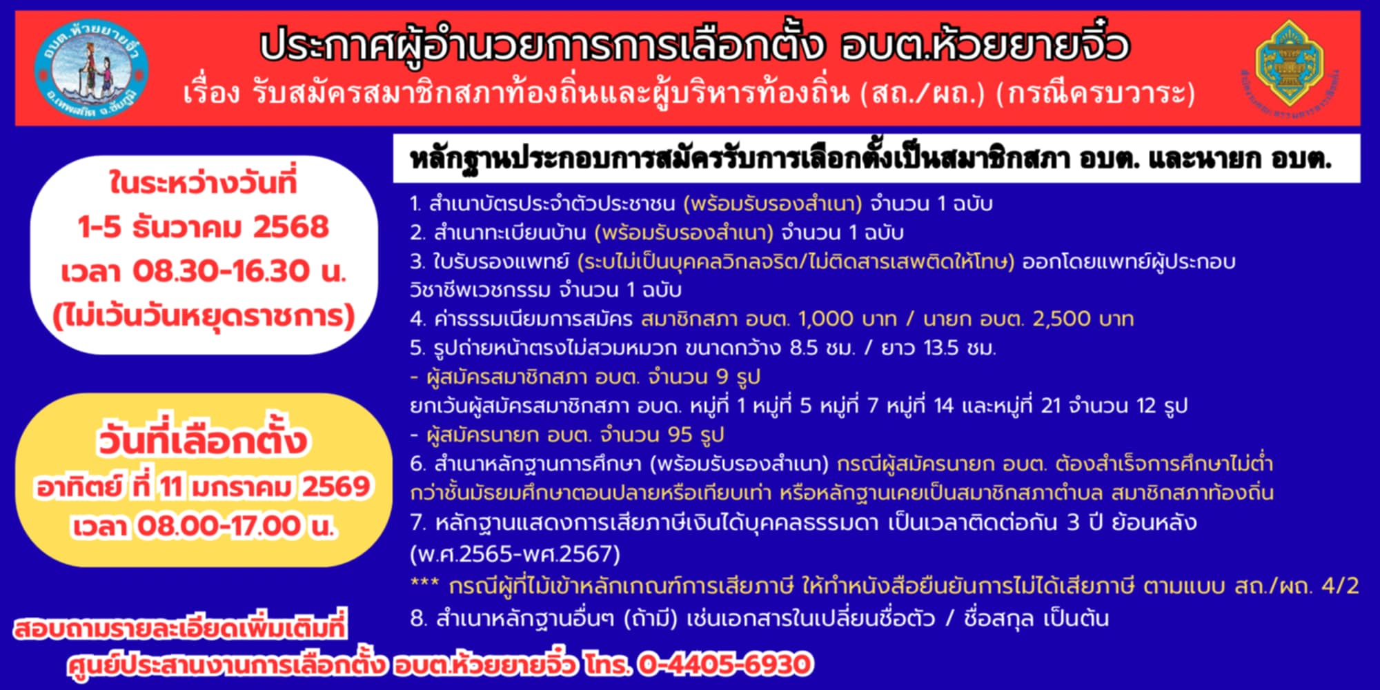 ประกาศ ผู้อำนวยการการเลือกตั้ง อบต.ห้วยยายจิ๋ว